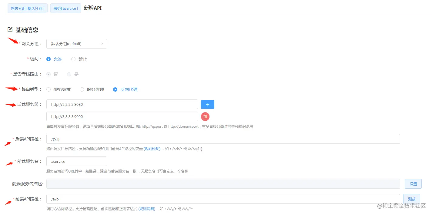 例如,需要网关代理后端接口 /a/b,接口部署于 2.2.2.2:8080 和 3.3.3.3:9090,可通过配置 “反向代理” 路由完成: