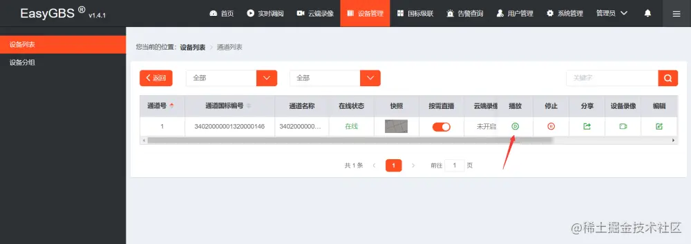 3)将支持音频的设备接入EasyGBS平台,在【设备管理】中,点击播放: