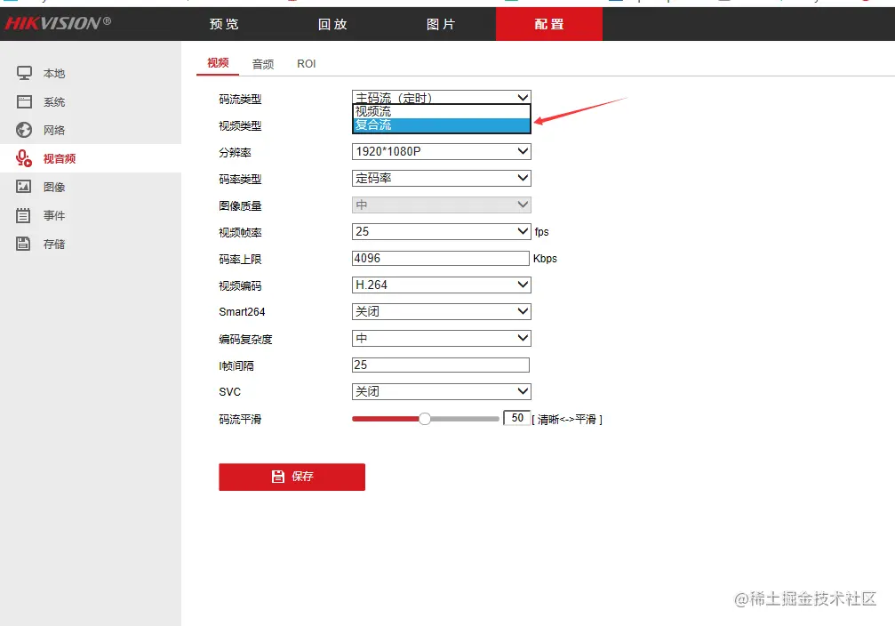 2)在摄像头的配置中开启复合流,点击保存,示例如下: