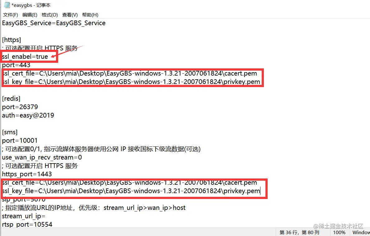 1)在EasyGBS服务端开启https访问,在EasyGBS目录ini文件修改配置,如下图: