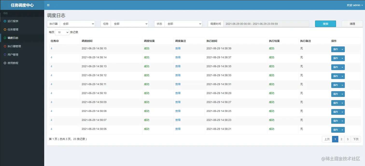 点击调度日志,可查看执行结果,调度时间与执行时间,可以看到它是实时调度,但执行等上一个执行完成才执行