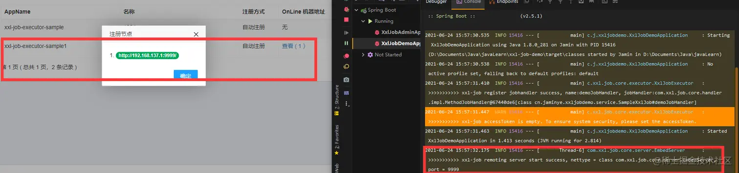 - 启动执行,可以从控制台看到注册成功,以及调度中心online机器地址(没有配置主机ip会自动获取,ip默认为9999)
