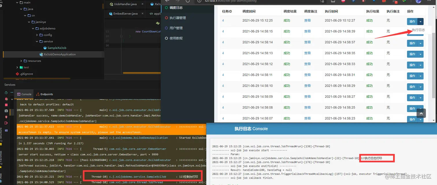 查看控制台可以看到代码中控制台打印的日志,在执行日志中可以看到xxl打印的日志