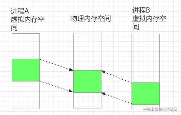 现代操作系统中,对于内存管理,采用的是虚拟内存技术,也就是每个进程都有自己的独立虚拟空间。不同进程的虚拟内存映射到不同的物理内存。因而为了在多个进程间交换信息,内核专门开辟了一块内存区域,不同的进程将其映射到自己的私有地址空间。这样A进程写入的数据,另一个B进程立刻就可以看到,避免了数据的拷贝,大大提高了进程间的通信速度。如下所示: