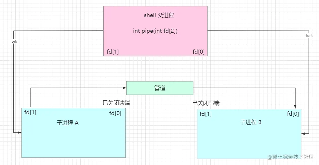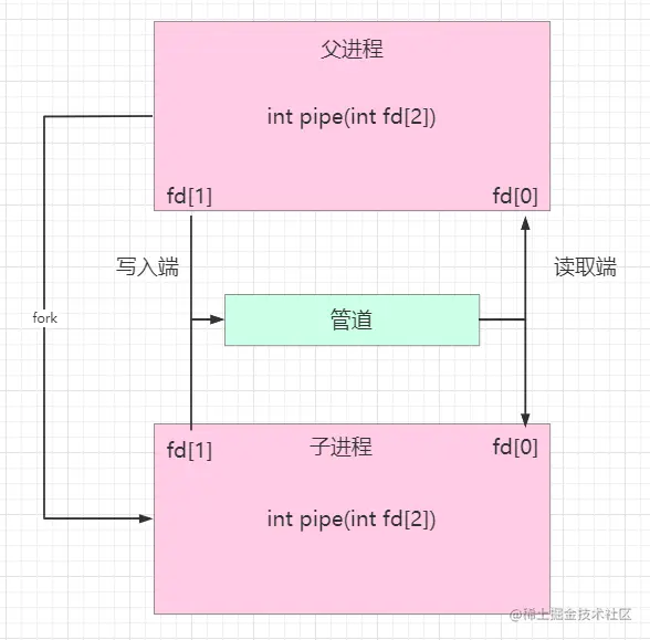 我们可以使用fork命令来创建子进程,创建的子进程会复制父进程的文件描述符,这样两个进程分别就各有两个fd[0]和fd[1],两个进程就可以通过各自的fd写入和读取同一个管道文件实现跨进程通信了。