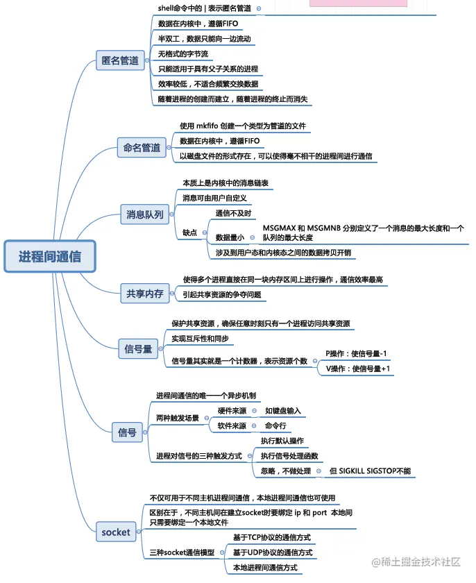 进程间通信机制共有七种,分别是匿名管道、命名管道、消息队列、共享内存、信号量、信号以及Scocket。各有不同的优缺点。下面我们分别来解释一下。