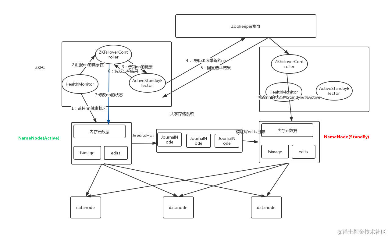 NameNode 主备切换主要由 ZKFailoverController、HealthMonitor 和 ActiveStandbyElector 这 3 个组件来协同实现: