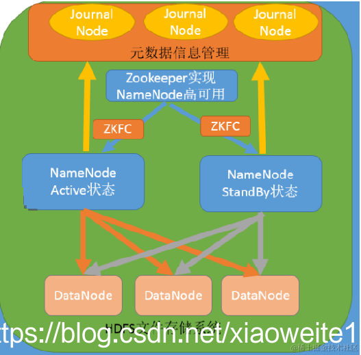 元数据信息共享存储系统:共享存储系统是实现 NameNode 的高可用最为关键的部分,共享存储系统保存了 NameNode 在运行过程中所产生的 HDFS 的元数据。主 NameNode 和备用NameNode 通过共享存储系统实现元数据同步。在进行主备切换的时候,新的主 NameNode 在确认元数据完全同步之后才能继续对外提供服务。