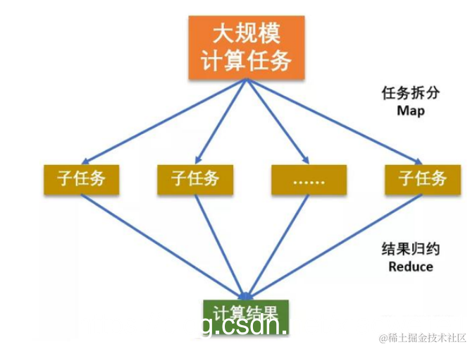**Map负责“分” **,即把复杂的任务分解为若干个“简单的任务”来并行处理。可以进行拆分的前提是这些小任务可以并行计算,彼此间几乎没有依赖关系。