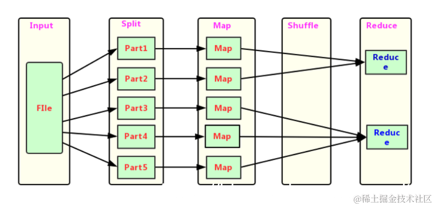 这两个阶段合起来正是MapReduce思想的体现。