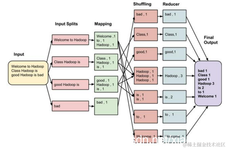 MapReduce 的开发一共有八个步骤, 其中 Map 阶段分为2个步骤,Shuffle 阶段 4 个步骤,Reduce 阶段分为2个步骤