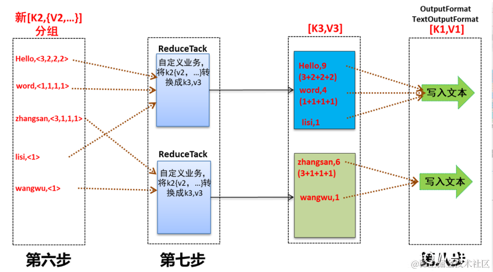 8、对多个map任务的输出进行合并、排序。编写reduce方法,在此方法中将K2和[V2]进行处理,转换成新的key、value(K3和V3)输出,并把reduce的输出保存到文件中。