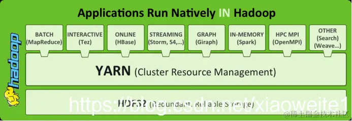 - yarn与运行的用户程序完全解耦,意味着yarn上可以运行各种类型的分布式运算程序,比如mapreduce、storm,spark,tez ……