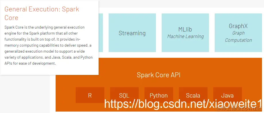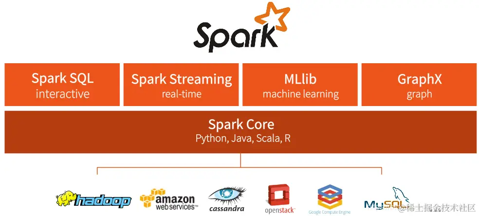 整个Spark 框架模块包含:Spark Coke、 Spark SQL、 Spark Streaming、 Spark GraphX、 Spark MLlib,而后四项的能力都是建立在核心引擎之上 。