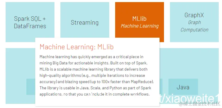 提供常见的机器学习(ML)功能的程序库。包括分类、回归、聚类、协同过滤等,还提供了模型评估、数据导入等额外的支持功能。 数据结构:RDD或者DataFrame
