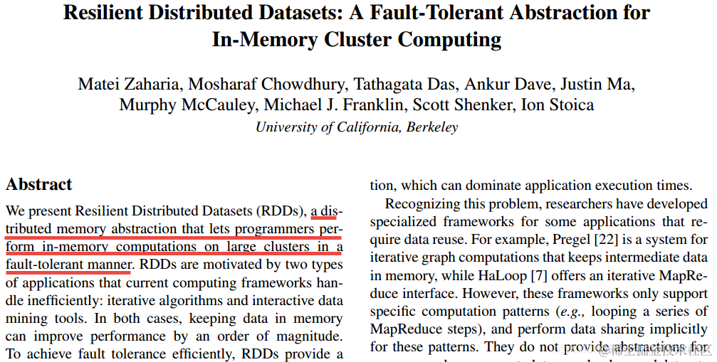 AMP实验室发表的一篇关于RDD的论文:《Resilient Distributed Datasets: A Fault-Tolerant Abstraction for In-Memory Cluster Computing》就是为了解决这些问题的