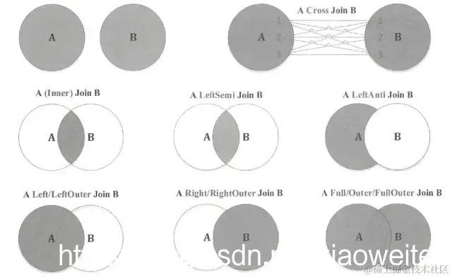 首先回顾一下SQL JOIN,用Venn图表示如下: