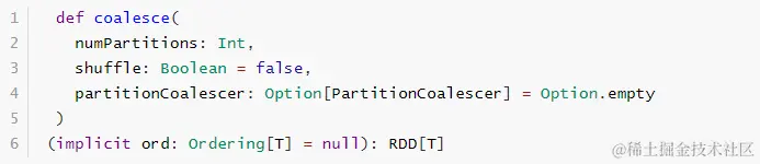 函数名称:coalesce,shuffle参数默认为false,不会产生Shuffle,默认只能减少分区