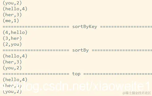 在上述词频统计WordCount代码基础上,对统计出的每个单词的词频Count,按照降序排序,获取词频次数最多Top3单词。