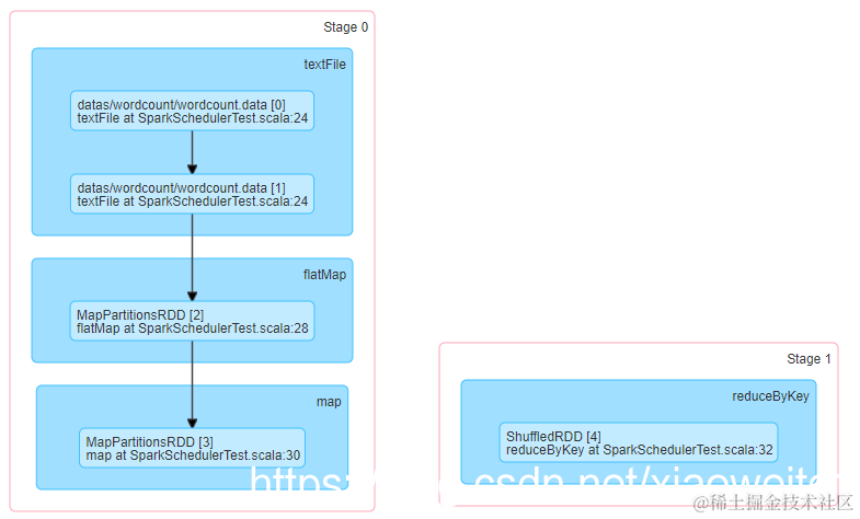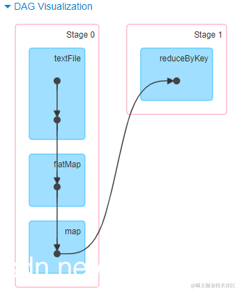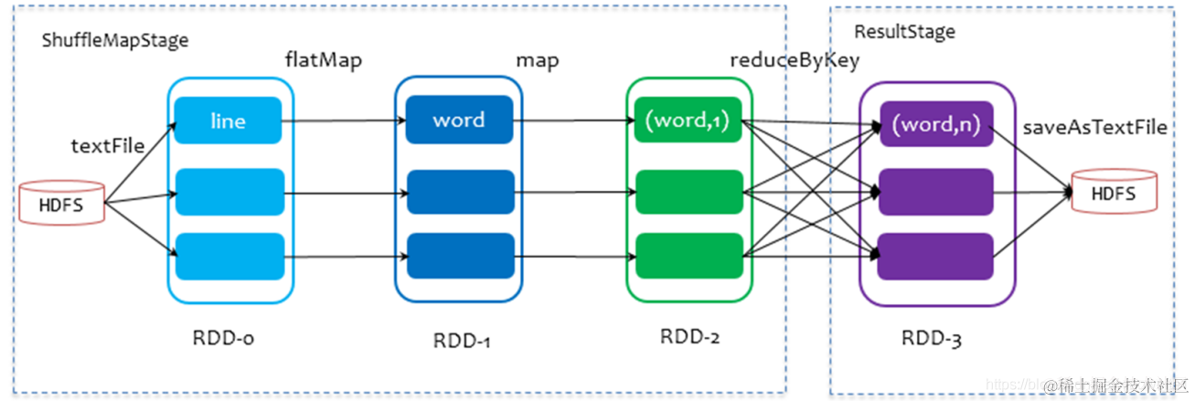 以词频统计WordCount程序为例,Job执行是DAG图: