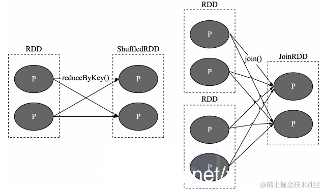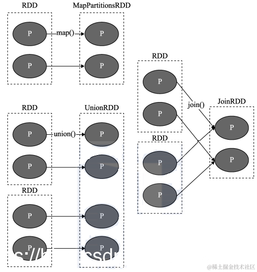 上图中 P代表 RDD中的每个分区(Partition),我们看到,RDD 中每个分区内的数据在上面的几种转移操作之后被一个分区所使用,即其依赖的父分区只有一个。比如图中的 map、union 和 join 操作,都是窄依赖的。注意,join 操作比较特殊,可能同时存在宽、窄依赖。