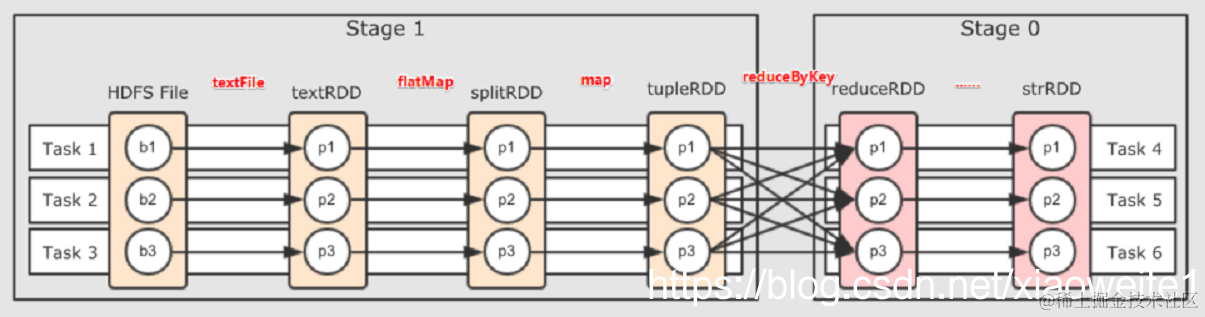 把DAG划分成互相依赖的多个Stage,划分依据是RDD之间的宽依赖,Stage是由一组并行的Task组成。Stage切割规则:从后往前,遇到宽依赖就切割Stage。