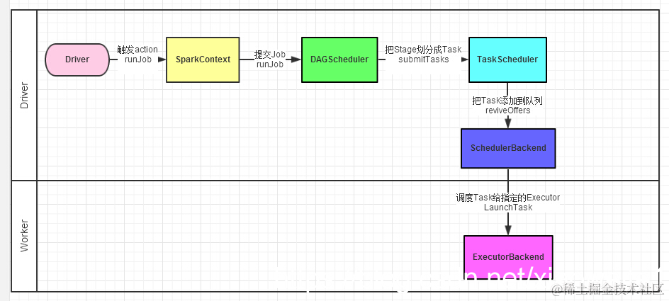 当RDD调用Action函数(比如count、saveTextFile或foreachPartition)时,触发一个Job执行,调度中流程如下图所示: