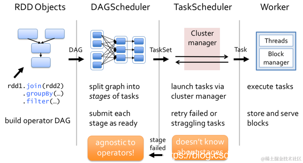DAGScheduler负责Stage级的调度,主要是将DAG依据RDD宽依赖切分成若干Stages,并将每个Stage打包成TaskSet交给TaskScheduler调度。