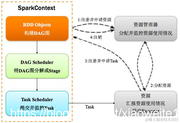 1.当一个Spark应用被提交时,首先需要为这个Spark Application构建基本的运行环境,即由任务控制节点(Driver)创建一个SparkContext(还会构建DAGScheduler和TaskScheduler)