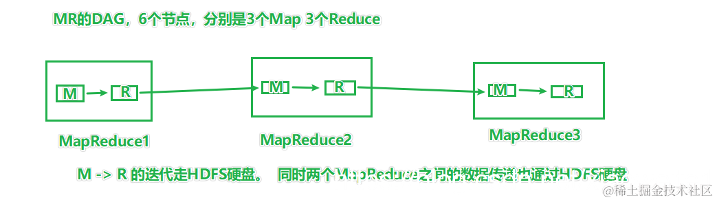 - MR计算模型的算子匮乏,只有Map和Reduce两个算子,导致复杂任务需要串接多个MR任务,中间的传输都经过HDFS硬盘
