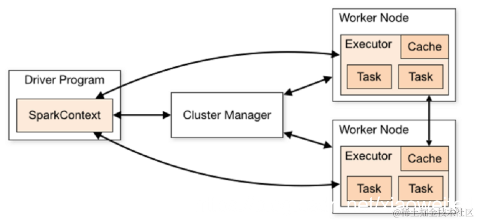 4.ClusterManager:集群管理器,对于Standalone模式,就是Master,对于Yarn模式就是ResourceManager/ApplicationMaster,在集群上做统一的资源管理的进程