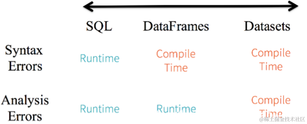 针对RDD、DataFrame与Dataset三者编程比较来说,Dataset API无论语法错误和分析错误在编译时都能发现,然而RDD和DataFrame有的需要在运行时才能发现。