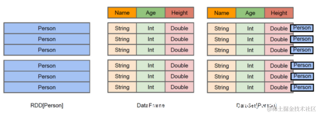 上图中左侧的RDD[Person]虽然以Person为类型参数,但Spark框架本身不了解Person类的内部结构。而中间的DataFrame却提供了详细的结构信息,使得Spark SQL可以清楚地知道该数据集中包含哪些列,每列的名称和类型各是什么。了解了这些信息之后,Spark SQL的查询优化器就可以进行针对性的优化。后者由于在编译期有详尽的类型信息,编译期就可以编译出更加有针对性、更加优化的可执行代码。官方定义: