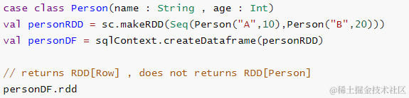 下面的示例中,一旦我们从personRDD创建personDF,将不会恢复Person类的原始RDD(RDD [Person]);