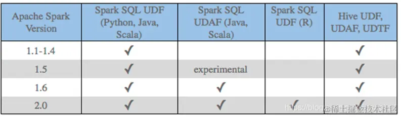 目前来说Spark 框架各个版本及各种语言对自定义函数的支持: