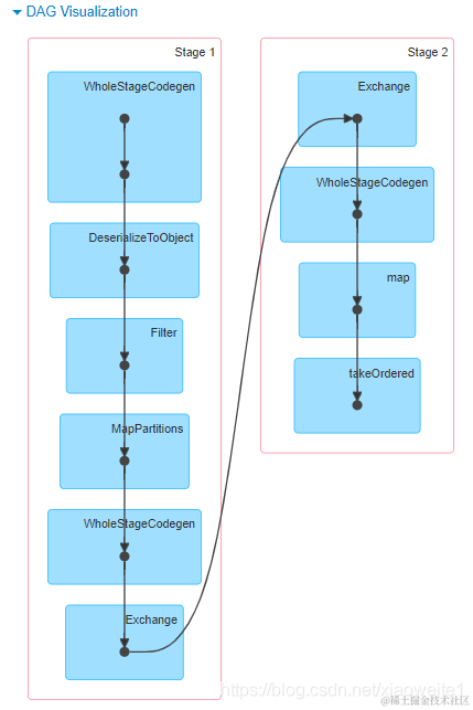 无论使用DSL还是SQL编程方式,底层转换为RDD操作都是一样,性能一致,查看WEB UI监控中Job运行对应的DAG图如下: