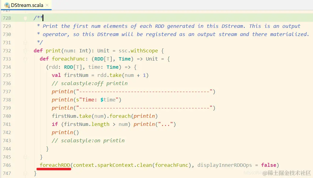 foreachRDD函数属于将DStream中结果数据RDD输出的操作,类似transform函数,针对每批次RDD数据操作,但无返回值