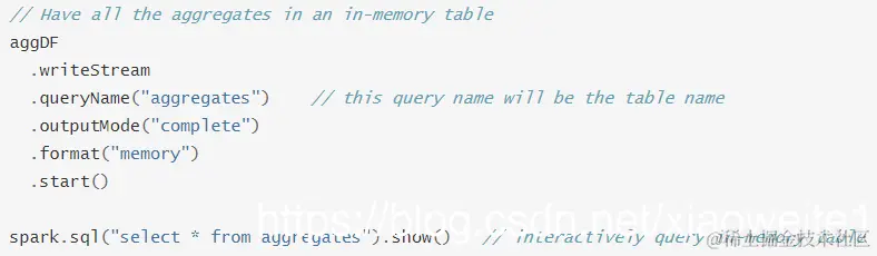 此种接收器作为调试使用,输出作为内存表存储在内存中, 支持Append和Complete输出模式。这应该用于低数据量的调试目的,因为整个输出被收集并存储在驱动程序的内存中,因此,请谨慎使用,示例如下: