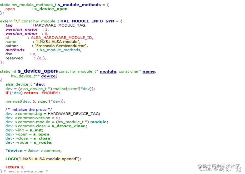 其函数的具体实现如下图,创建时会去获取对应的Module “alsa”,并尝试去打开这个Module,然后去调用设备的初始化进行初始化。
