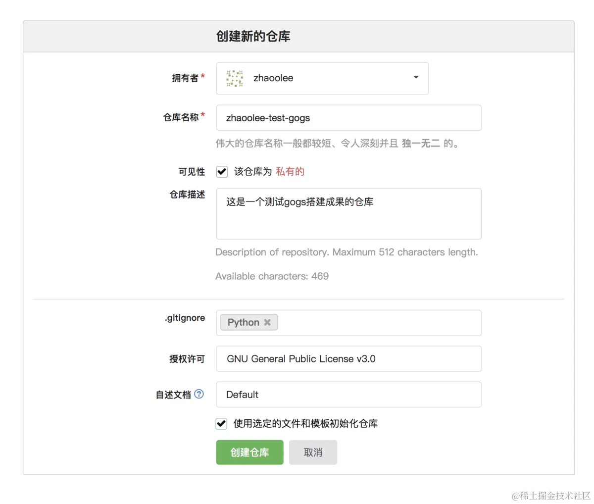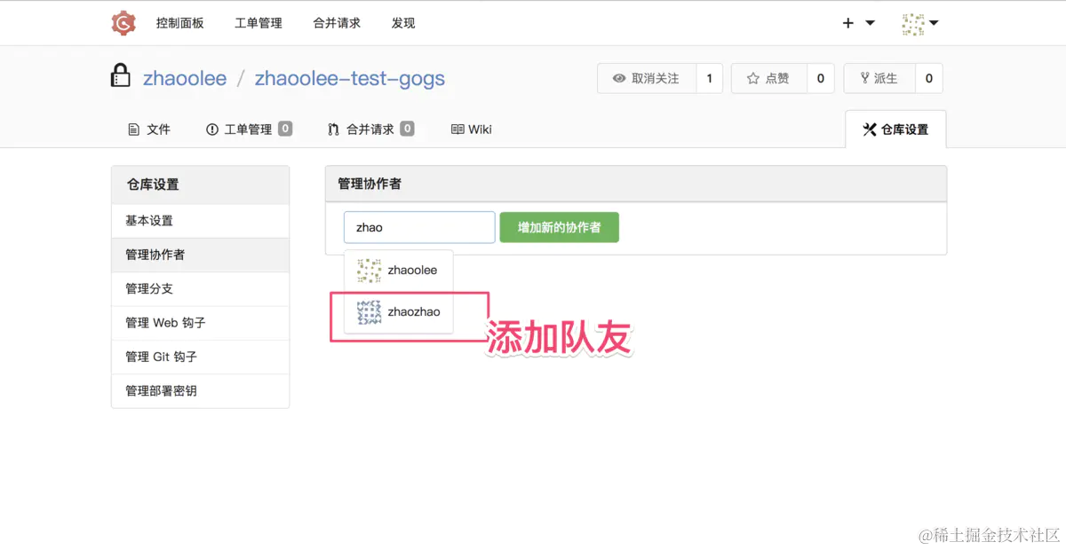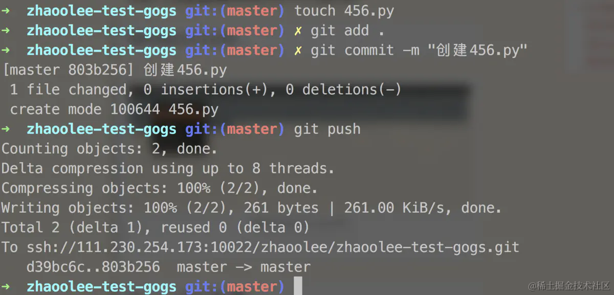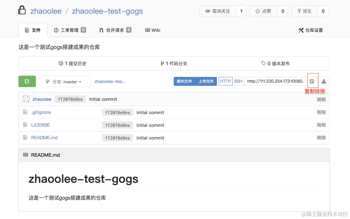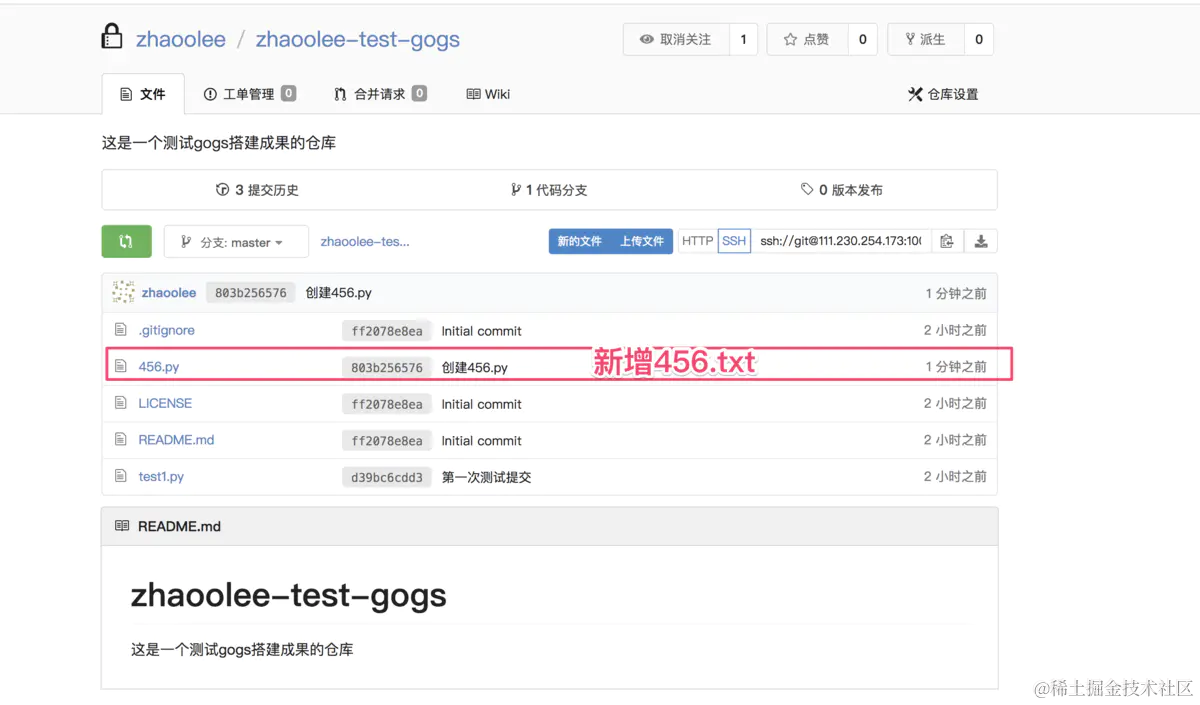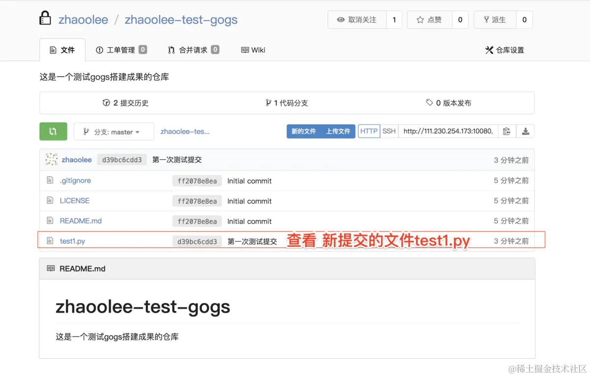 zhaoolee-test-gogs, 并完成一次push操作