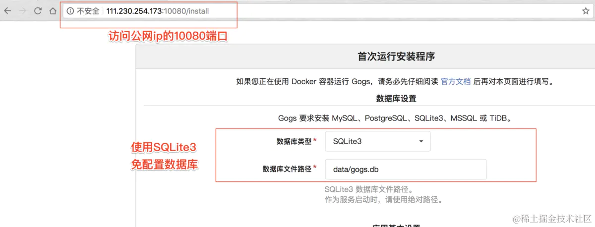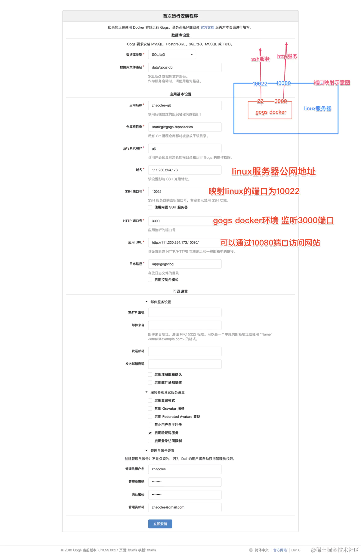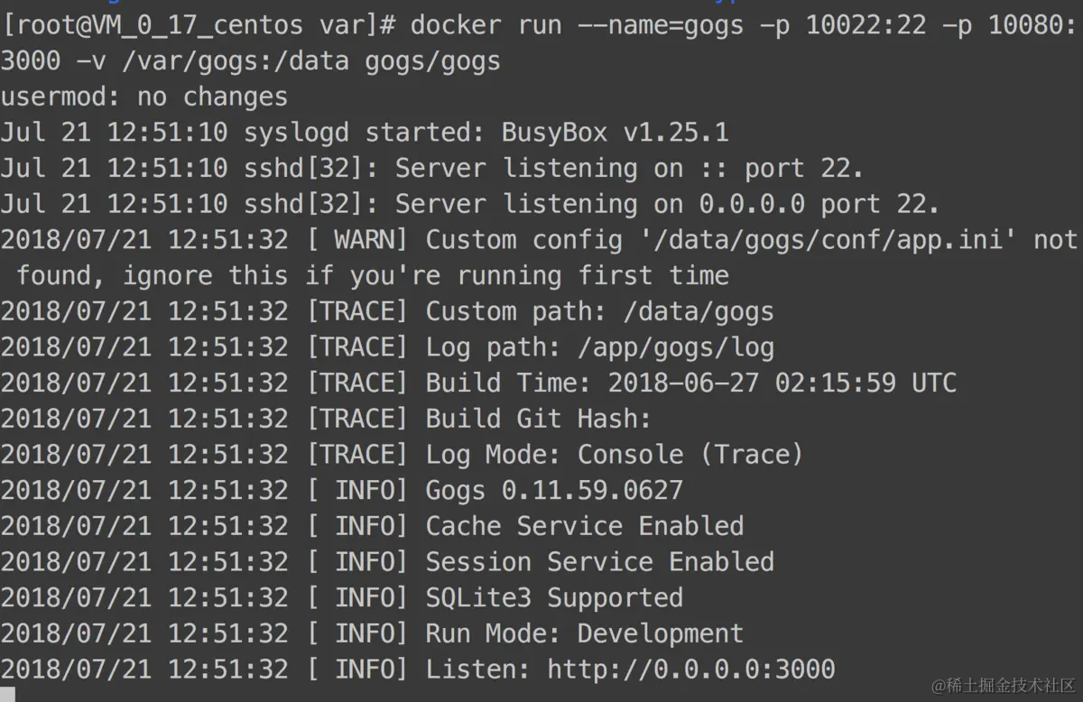 docker run --name=gogs -p 10022:22 -p 10080:3000 -v /var/gogs:/data gogs/gogs