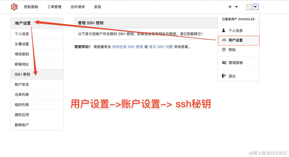 - 用户设置->账户设置->ssh秘钥