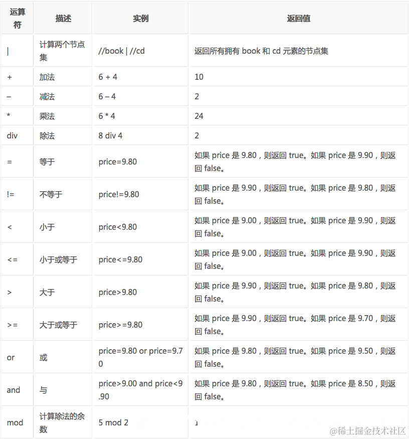 | /bookstore/book[price>35.00] | 选取 bookstore 元素的所有 book 元素,且其中的 price 元素的值须大于 35.00。 |