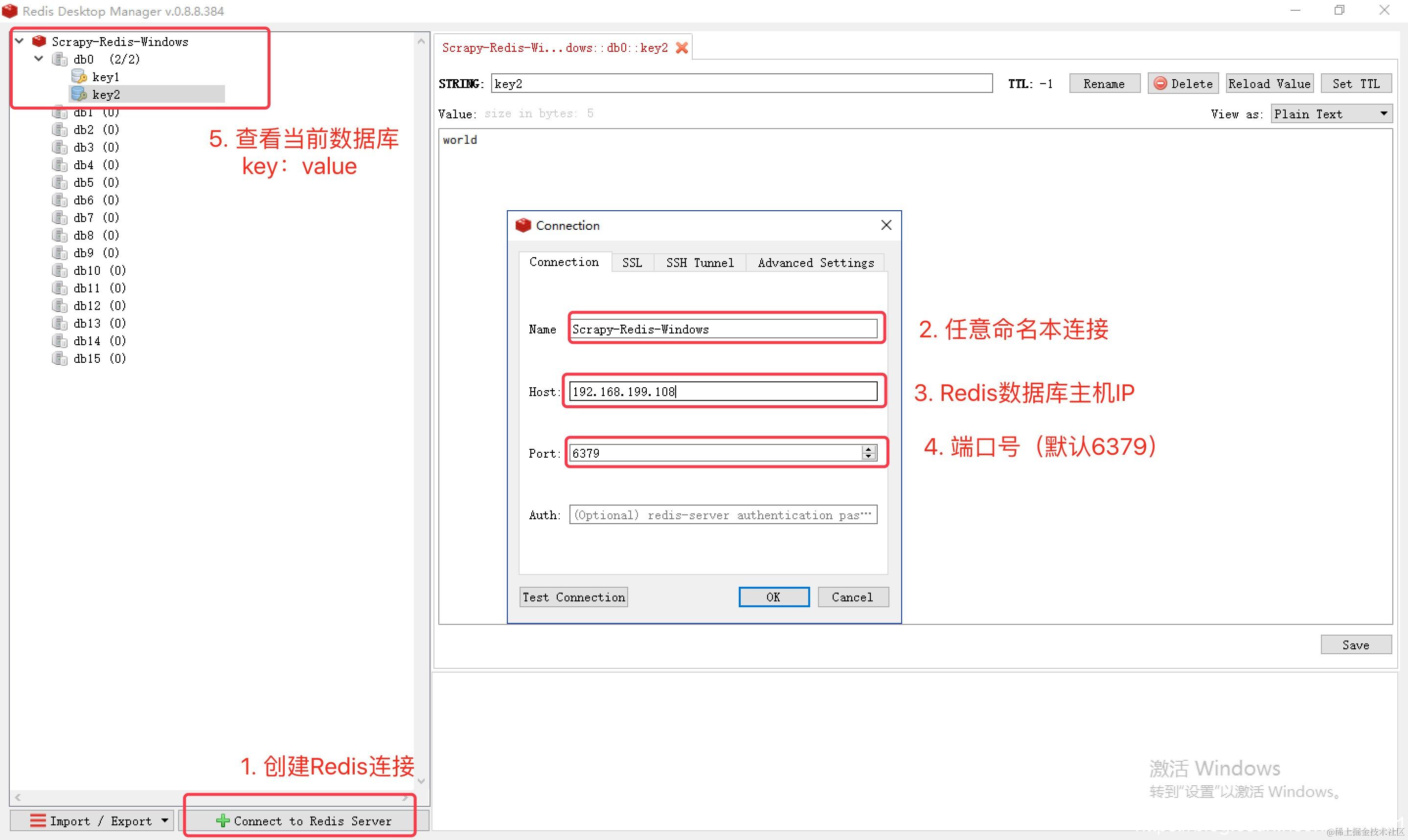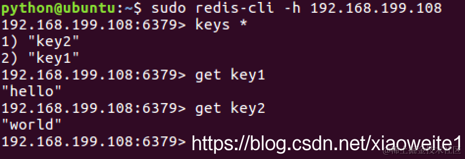 redis-cli -h 192.168.199.108,-h 参数表示连接到指定主机的redis数据库