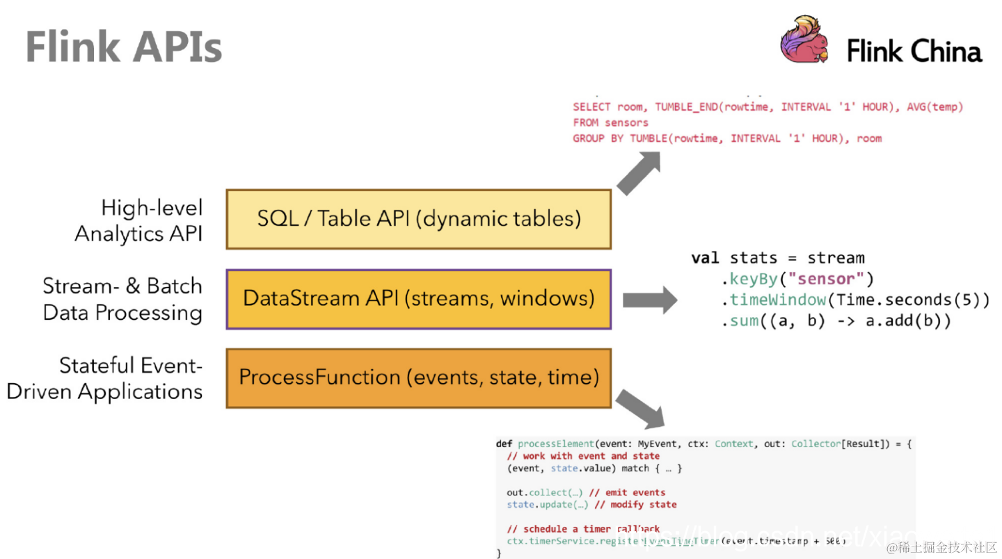 Flink提供了多个层次的API供开发者使用,越往上抽象程度越高,使用起来越方便;越往下越底层,使用起来难度越大