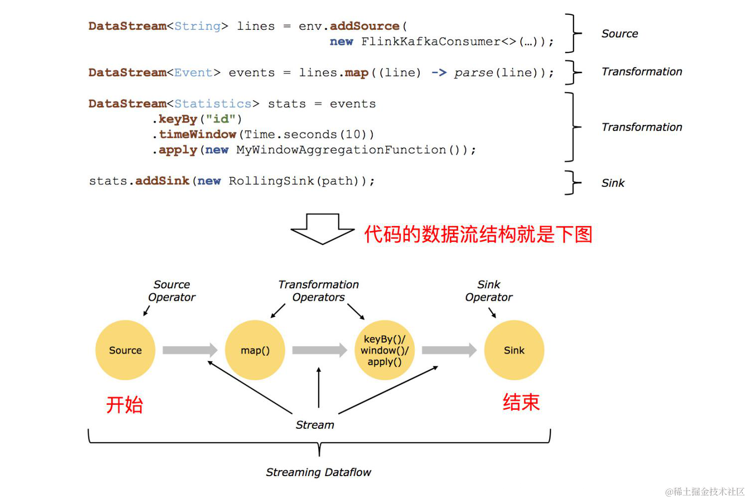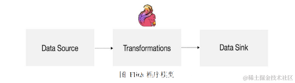 Flink 应用程序结构主要包含三部分,Source/Transformation/Sink,如下图所示:
