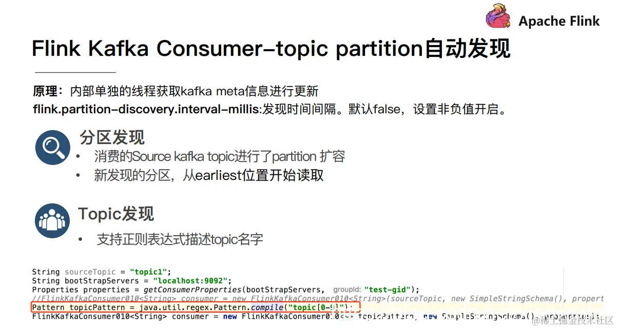 l针对场景一,还需在构建 FlinkKafkaConsumer 时,topic 的描述可以传一个正则表达式描述的 pattern。每次获取最新 kafka meta 时获取正则匹配的最新 topic 列表。