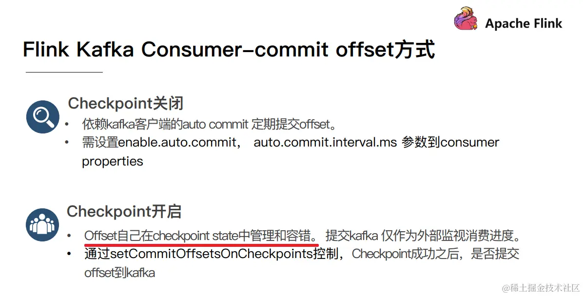 开启 checkpoint 时 offset 是 Flink 通过状态 state 管理和恢复的,并不是从 kafka 的 offset 位置恢复。在 checkpoint 机制下,作业从最近一次checkpoint 恢复,本身是会回放部分历史数据,导致部分数据重复消费,Flink 引擎仅保证计算状态的精准一次,要想做到端到端精准一次需要依赖一些幂等的存储系统或者事务操作。