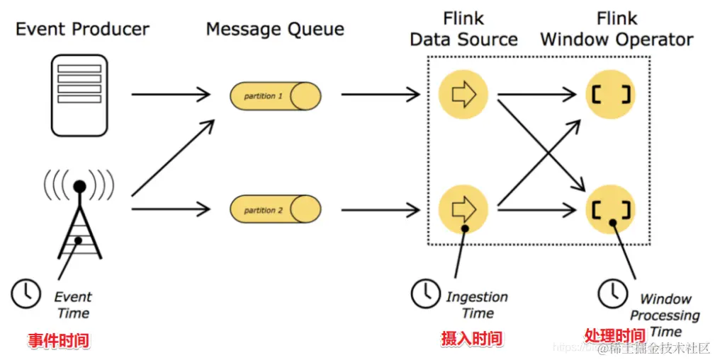 在Flink的流式处理中,会涉及到时间的不同概念,如下图所示: