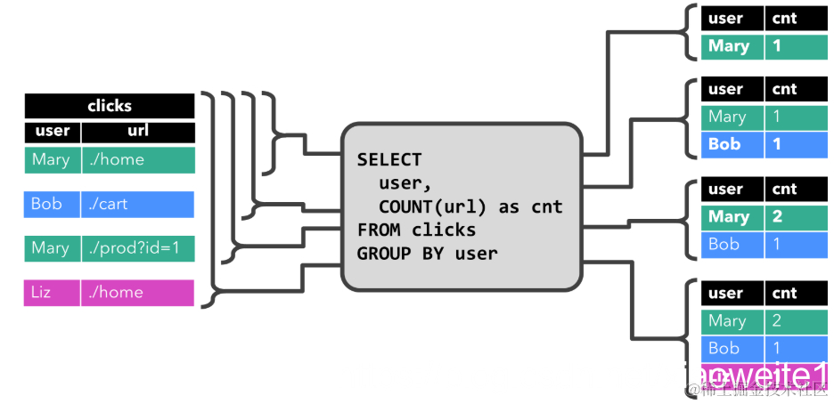 我们前面提到的表示不断地Append,表的数据是一直累加的,因为表示对接Source的,Source是不会有update的。但如果我们编写了一个SQL。这个SQL看起来是这样的:
